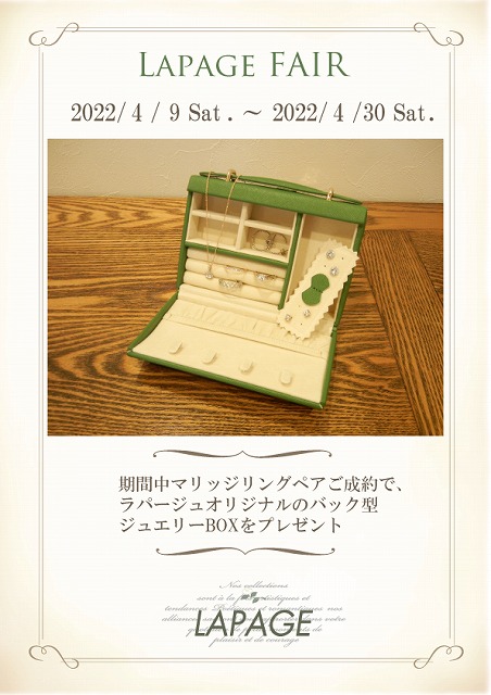 フェア期間中LAPAGEの結婚指輪をペアでご成約のお客様へ、LAPAGEオリジナルバック型ジュエリーボックスをプレゼント!